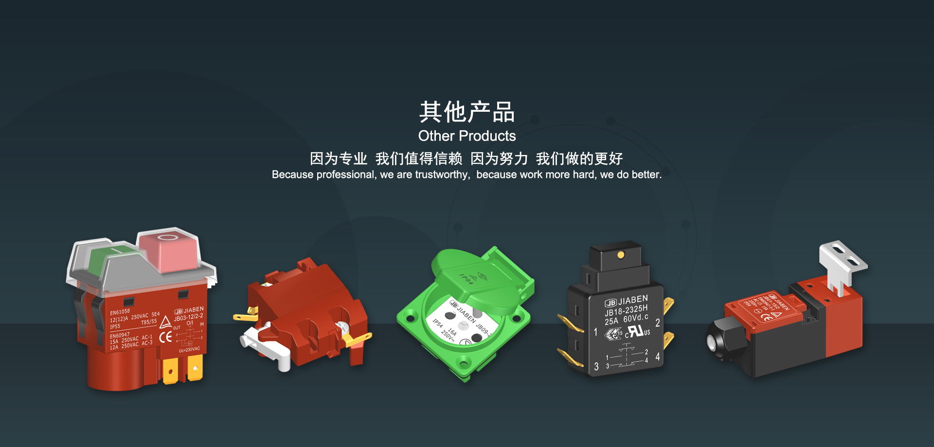 浙江佳奔電子有限公司始建于1986年,坐落于浙江省樂清市虹橋鎮(zhèn)東電子信息產(chǎn)業(yè)園內(nèi),現(xiàn)有職工700多人,資產(chǎn)總額超3億元。公司主要經(jīng)營“JIABEN”牌微動(dòng)開關(guān)、蹺板開關(guān)、按鈕開關(guān)、扳機(jī)開關(guān)、調(diào)速開關(guān)和電位器開關(guān)等各類交、直流器具開關(guān)和各類交、直流線路板模塊等產(chǎn)品,主要應(yīng)用于交、直流電動(dòng)工具、電動(dòng)園林工具、清潔器具、家用電器和小型機(jī)床等行業(yè),是集產(chǎn)品設(shè)計(jì)、研發(fā)、制造、銷售和服務(wù)于一體的國家高新技術(shù)企業(yè)。JIABEN was founded in 1986, located in East Electronic Information Industry Park, Hongqiao Town, Yueqing City, Zhejiang Proviance, existing staff more than 700 peoples, more than 300 million RMB worth of assets. Company is mainly engaged in "JIABEN" brand Micro Switch, Rocker Switch, Push-button Switch, Trigger Switch, Speed Regulating Switch, Potentiometer Switch and other kinds of appliance switch and all kinds of AC or DC circuit board module, such as more than 100 series, 8000 kinds of models of products, mainly used in AC or DC Power-tools, Power Gardening Tools, Cleaning Appliances, Household Appliances and Small Machine Tool and other industries, is the collection product design, research and development, manufacturing, sales and service in one of the national high and new technology enterprise.